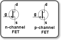 As with the BJTs, FETs have three connections, called the gate (g), the source (s) and the drain (d). In n-channel FETs, the gate is connected to an p-type semiconductor, while in the p-channel FETs, the gate is connected to a n-type semiconductor.